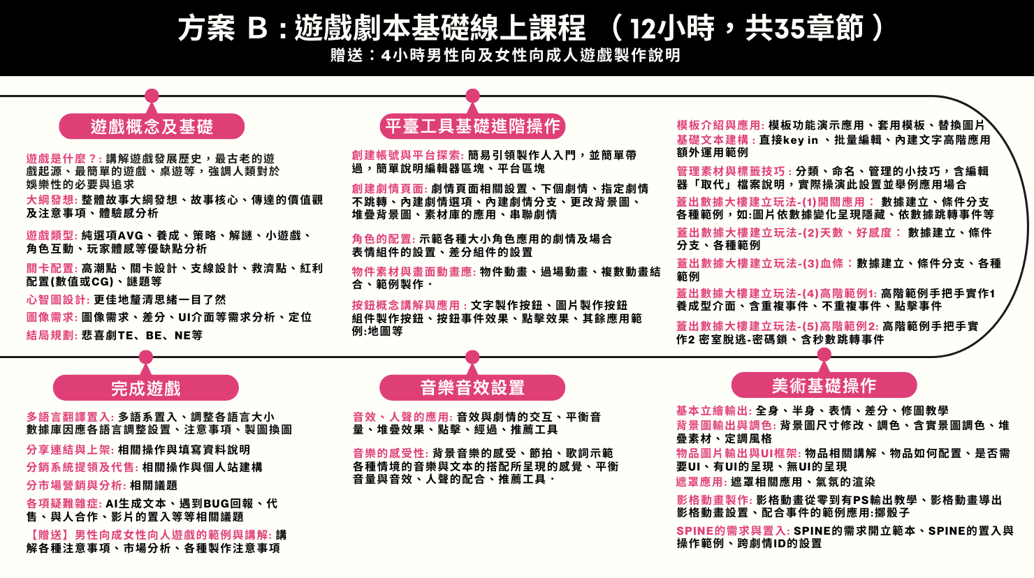 這課程是零基礎課程,沒有任何經驗也合適。課程會提供操作工具以及講解理論,讓你用高效率的方式學會並且實際應用在作品上。重點會著重在於劇本創作設計、人物劇情設計,而非花期間研究複雜的技術代碼。
